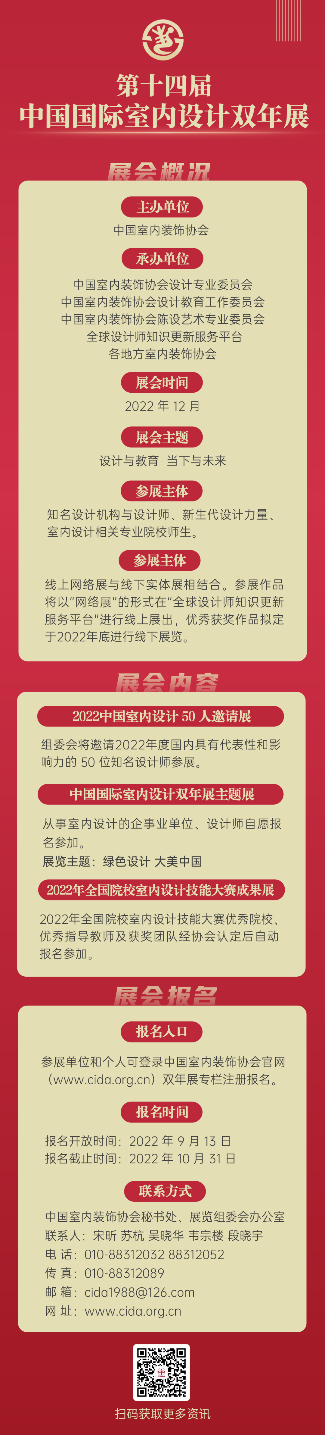 “中国国际室内设计双年展”由中国室内装饰协会于1996年创办,历经20多年精心培育,被誉为中国室内设计“风向标”。在“十四五”开局良好、室内装饰行业高质量发展初见成效的局面下,为引领设计创新潮流,推动人才培养和产业发展,提振室内装饰、室内设计发展活力,中国室内装饰协会将举办“第十四届中国国际室内设计双年展”。
