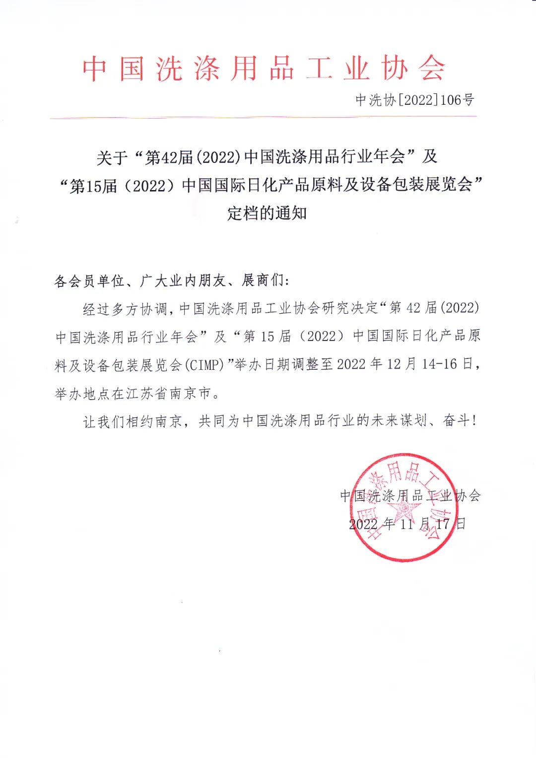 关于“第42届(2022)中国洗涤用品行业会”及“第15届(2022)中国国际日化产品原料及设备包装展览会”定档的通知