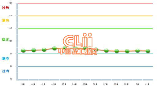 2013年11月中轻陶瓷主营业务收入景气指数92.15。从区间走势看,近一年以来主营业务收入指数连续处于稳定区域。指数在2013年5月至阶段高位,之后连续4个月小幅下行,10月份止跌企稳,11月份小幅回落。参见图2-1。
