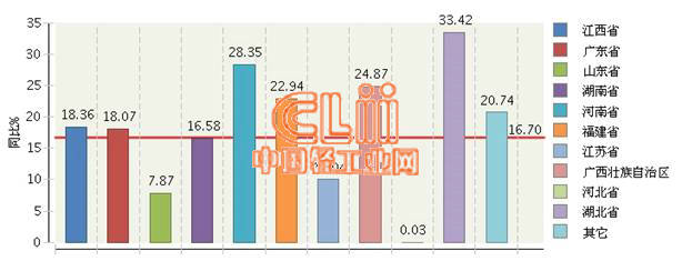 2013年1~11月全国陶瓷行业规模以上企业累计完成主营业务收入前三位地区分别是江西、广东、山东,其中:江西完成累计主营业务收入超过500亿元(同比增长18.36%),占19.04%;广东累计同比增长18.07%,占17.38%;山东累计占17.14%,同比增长7.87%。湖北、河南、广西、福建等地区累计同比增速居前,同比增长均在20%以上。详见图2-3、2-4。