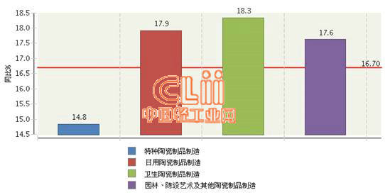 2013年1~11月,特种陶瓷制品制造累计完成主营业务收入超过1000亿元(同比增长14.84%),占40.35%,占比居各子行业首位。卫生陶瓷制品制造累计完成主营业务收入占17.03%,同比增长18.34%,增速居各子行业首位。详见图2-5、2-6。