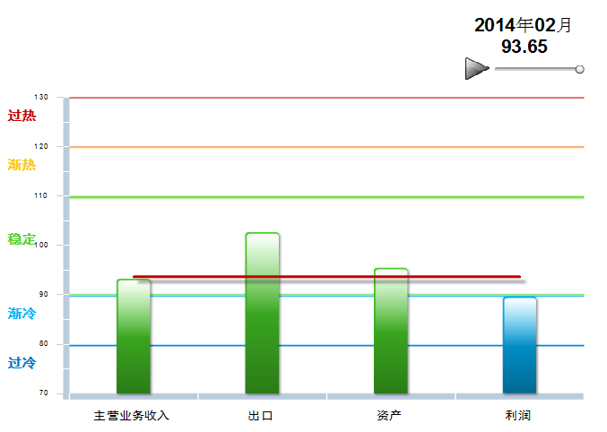 和中国皮革工业协会联合发布2014年2月中轻皮革景气指数。2月份中轻皮革景气指数93.65,较2014年12月的93.39略升0.26个百分点。其中:主营业务收入景气指数为93.24,出口景气指数为102.66,资产景气指数为95.48,三指数在稳定提示区;利润景气指数为89.63,在渐冷提示区(参见图1、2)。