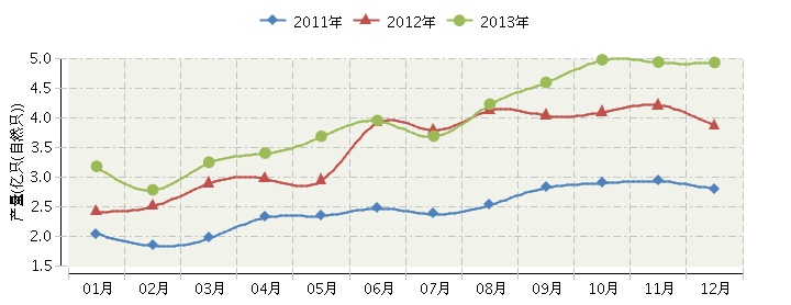 2013年全国锂离子电池行业连续三年月度产量对比