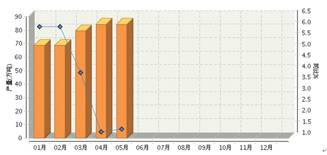 根据国家统计局公布数据, 2014年1~5月,全国规模以上罐头企业累计完成产量398.38万吨,同比增长4.05%。其中:1月份完成产量68.56万吨,同比增长6.04%;2月份产量68.56万吨,增长6.04%;3月份产量79.5万吨,增长3.96%;4月份产量84.31万吨,增长1.28%;5月份产量84.29万吨,增长1.4%。