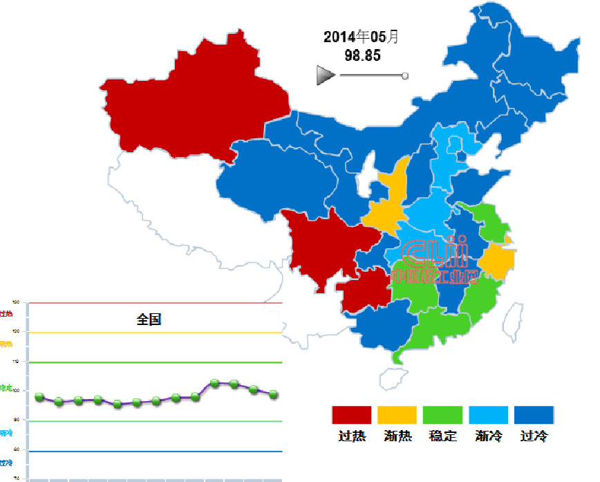 2014年5月,处于“稳定”区间的地区有4个,分别是:江苏、福建、广东、湖南,占全国的12.90%。处于“浙热”区间的地区有2个,分别是:甘肃、浙江。处于“过热”区间的地区有3个,分别是:新疆、四川和贵族。处于“渐冷”区间的地区有4个,分别是:河北、河南、湖北、北京。其它地区均处于过冷状态(不含西藏、云南、宁夏、海南)(图3)。