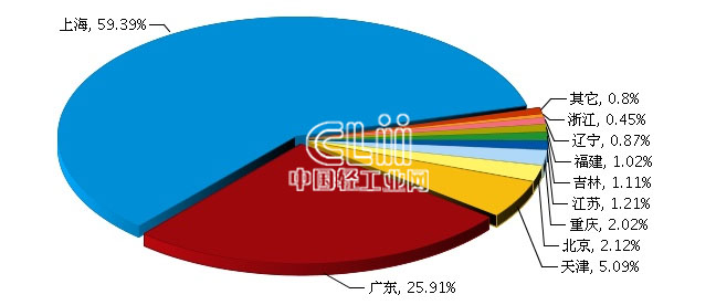 从分省市对日本进口情况看,上海、广东、天津是主要进口区域,其中上海的进口额占到了全国的59.39%。