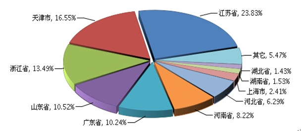 从地区分布上看,自行车行业生产主要集中在江苏省、天津市、浙江省、山东省、广东省等地区,这5省市的比重占全国的74.63%(参见图3