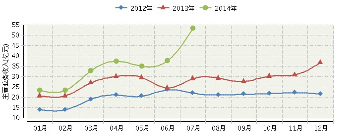 2014年1月~7月,全国文具制造行业累计完成主营业务收入243.37亿元,同比增长14.37%。其中:1月份完成主营业务收入23.43亿元,同比增长12.16%;2月份完成主营业务收入23.43亿元,同比增长12.16%;3月份完成主营业务收入32.9亿元,同比增长13.55%;4月份完成主营业务收入37.45亿元,同比增长22.07%;5月份完成主营业务收入35.07亿元,同比增长14.17%;6月份完成主营业务收入37.71亿元,同比增长11.11%;7月份完成主营业务收入53.39亿元,同比增长14.31%。
