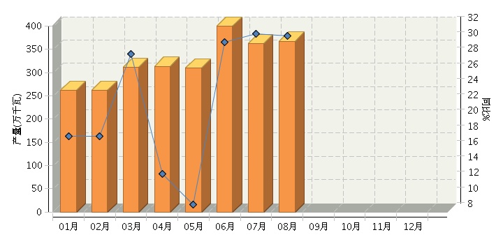 根据国家统计局公布数据,全国太阳能电池行业累计完成产量2,974.16万千瓦,同比增长27.91%。其中:8月份完成产量367.27万千瓦,同比增长30.75%。2014年全国太阳能电池行业月度产量及同比如下图所示。