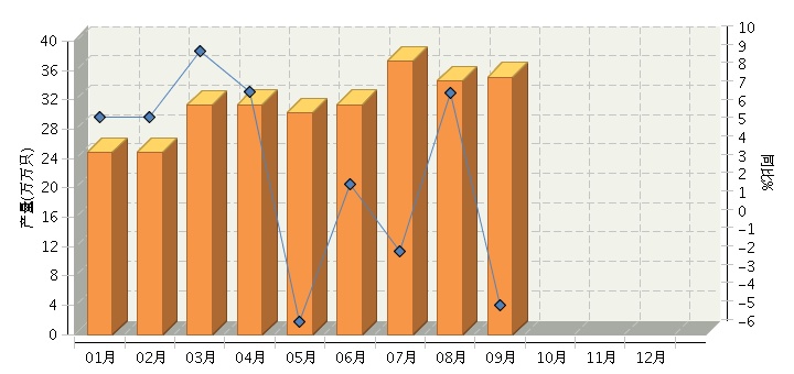 根据国家统计局公布数据,全国原电池及原电池组(折R20标准只)行业累计完成产量281.95亿只,同比增长-1.14%。其中:9月份完成产量35.07亿只,同比增长-4.37%。2014年全国原电池及原电池组行业月度产量及同比如下图所示。