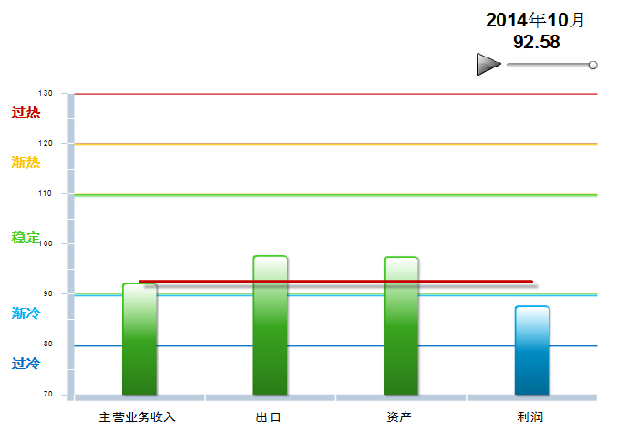 和中国皮革工业协会联合发布2014年10月中轻皮革景气指数。10月份中轻皮革景气指数92.58,较9月的92.91略降0.33个百分点。其中:主营业务收入景气指数为92.29,出口景气指数为97.77,资产景气指数为97.54,利润景气指数为87.73(参见图1、2)。