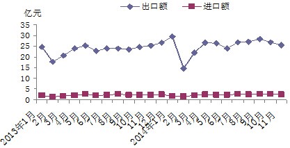 图:2013年1月—2014年11月文教化育用品进、出口额月度走势。