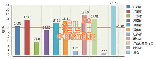 2014年1~11月全国陶瓷行业规模以上企业累计完成主营业务收入前三位地区依次是江西、广东、山东。其中江西、广东累计主营业务收入均超过500亿元:江西累计同比增长14.59%,占18.41%;广东累计同比增长17.46%,占16.94%。详见图2。