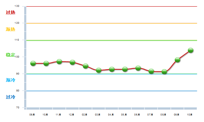 图2 2013.9----2014.10月工艺美术行业景气指数变化态势