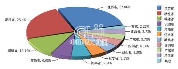 2015年1~2月,全国荧光灯行业完成累计产量5.37亿只,同比增长-4.82%。江苏、浙江、福建、安徽、河南是产量居全五位的省区,而去年同期产量和增速均居首位的是浙江。而今年1~2月,江苏超越浙江,产量和增速均居全国首位。2015年1~2月,江苏累计产量1.45亿只,占全国总产量的27.06%,浙江累计产量1.26亿只,占全国总产量的23.4%。