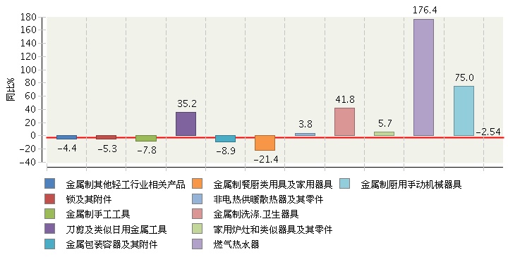 2015年4月,我国五金行业中,锁及其附件、金属制手工工具两行业完成进口额相对占比较高,分别为21.22%和19.66%。燃气热水器、燃气热水器、金属制洗涤.卫生器具、刀剪及类似日用金属工具、家用炉灶和类似器具及其零件、非电热供暖散热器及其零件六个子行业增速实现了正增长,且高于行业平均值。其中热水器行业增速最高,达176.4%;金属制餐厨类用具及家用器具行业增速下降最多,超过了20%。
