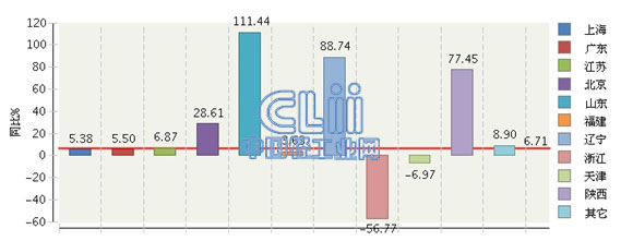 2015年1月~3月全国照明灯具行业累计进口额主要地区同比增长情况