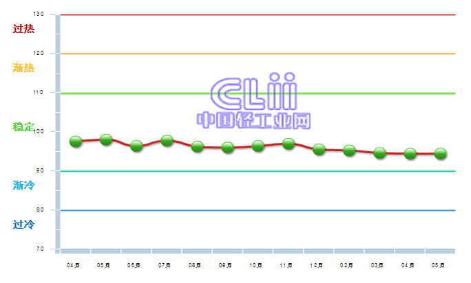 2015年5月中轻玩具经济运行指数为94.39,与去年同期相比下降了3.61个百分点,较4月份微降0.02个百分点(参见图1-1)。