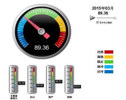 发布2015年3月中轻照明景气指数。3月,中轻照明景气指数89.39,其中:主营业务收入景气指数为91.22,出口景气指数为85.07,资产景气指数为95.21,利润景气指数为82.21(图1)。