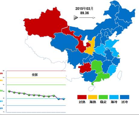 2015年3月,处于“稳定”区间的地区有2个,分别是:广东和湖南,占全国的6.45%。处于“过热”区间的地区有3个:甘肃、贵州和新疆,占全国的9.68%。处于“渐冷”区间的地区有4个,分别是:安徽、河南、福建和山东。其它地区均处于过冷状态(不含西藏、云南、宁夏、海南)(图3)。