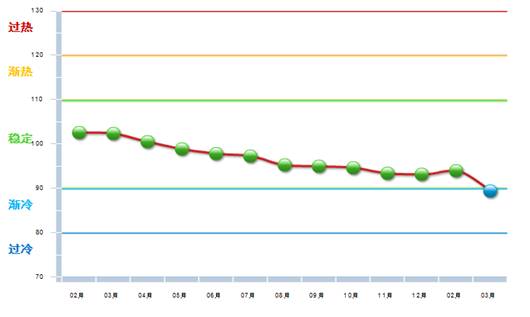 2015年3月中轻照明景气指数连续12个月在稳定区间运行,呈逐月走低趋势。3月景气指数首次进入渐冷区间(图2)。