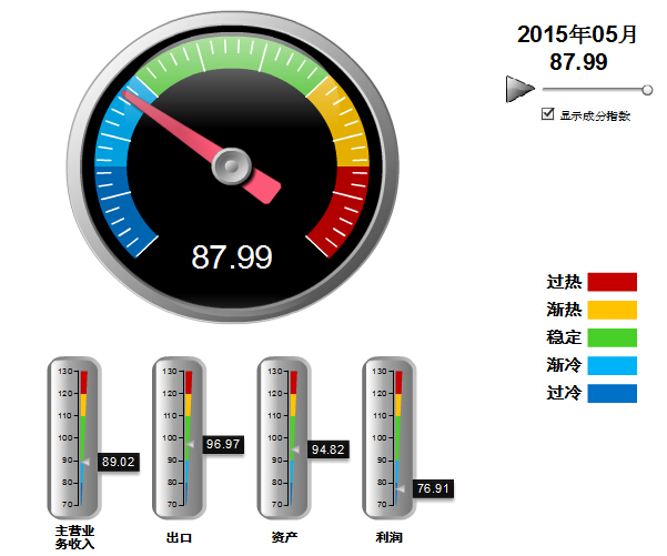和中国皮革工业协会联合发布2015年5月中轻皮革景气指数。5月份中轻皮革景气指数87.99,较4月的88.65下降0.66个百分点。其中:主营业务收入景气指数为89.02,出口景气指数为96.97,资产景气指数为94.82,利润景气指数为76.91(参见图1、2)。