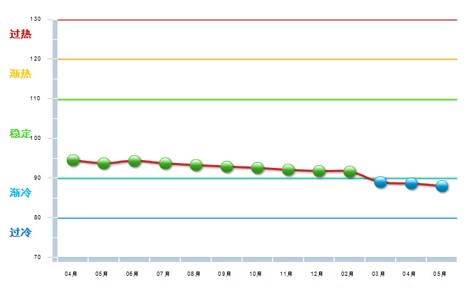 2014年4月至2015年2月,中轻皮革景气指数基本稳定,在90~100间小幅波动,处于稳定提示区的下半区。3月中轻皮革景气指数89首次跌入渐冷提示区,4、5月继续运行在渐冷提示区,预示皮革行业将面临困境(参见图3)。