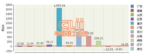 从出口增速看,在我国陶瓷砖出口主要地区中,重庆、四川、云南、湖南、江西出口额同比大幅增长,增速达70%以上;出口额居前两位的广东、福建出口增速均低于全国平均增速;在出口额前十地区中,辽宁为唯一负增长地区,详见图2。