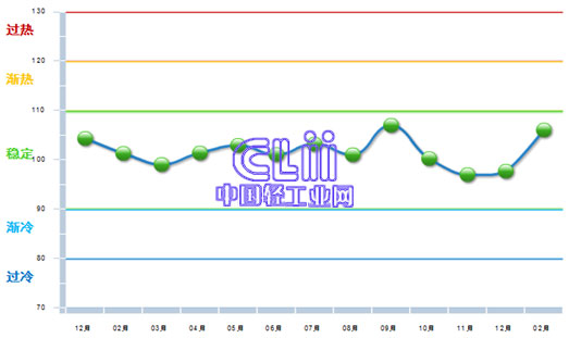 家具行业出口景气指数在2014年10~11月经过下挫调整后,于同年12月开始略有上升,在2015年2月重新回到了100基准线以上,当月比2014年12月提高了8.31个百分点(图1)。
