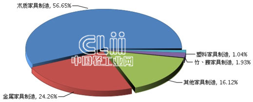 一季度,家具子行业中木质家具制造业累计利润总额(下同)占比达到56.65%,金属家具制造业居第二位,占24.26%,其他家具制造业占16.12%,竹、藤家具制造业占1.93%,塑料家具制造业占1.04%(图4)。