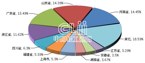 一季度,家具行业累计利润额居全国前十位的地区是河南、山东、广东、浙江、四川、福建、上海、湖南、安徽及江苏。其中,河南累计利润总额(下同)占14.45%,山东占14.39%,广东累占13.49%,浙江占11.62%,四川占6.30%,福建占5.39%,上海占5.30%,湖南占3.67%,安徽占3.50%,江苏占3.29%(图6)。与2014年同期相比,河南、山东、四川及湖南4个地区的占比出现不同程度的收窄,其他6个地区的占比则显示为扩大。