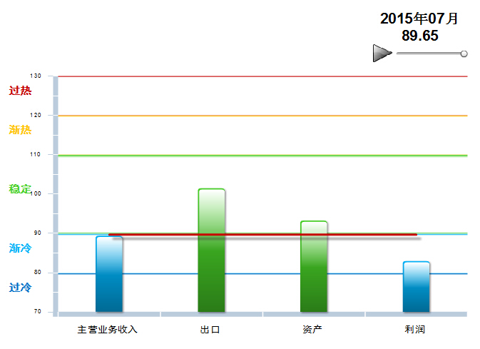 2014年6月至2015年2月,中轻皮革景气指数基本稳定,在90~100间小幅波动,处于稳定提示区的下半区。3月中轻皮革景气指数89首次跌入渐冷提示区, 6、7月虽然运行在渐冷提示区,但呈现企稳回升态势(参见图3)。