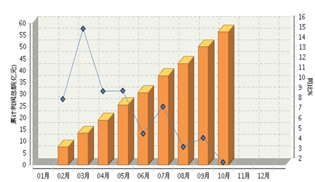 图1 2014.9—2015.10自行车行业利润景气指数变化态势 2015年1月~10月,全国自行车制造行业累计完成利润总额56.27亿元,同比增长2.24%,增速比9月份下降2个百分点。(参见图2)。 图2 自行车行业月度累计利润总额走势图 从子行业分布情况看,电动自行车行业累计利润总额近35亿元,同比下降4.62%;脚踏自行车行业累计利润总额超过21亿元,同比增长15.92%。
