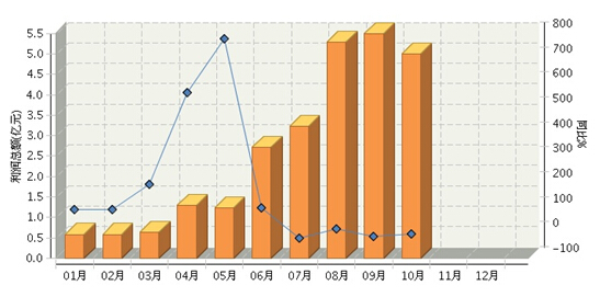 2015年1月~10月,广东玩具行业累计完成利润总额26.05亿元,同比增长17.90%。其中:1月份完成利润总额0.58亿元,同比增长95.23%;2月份完成利润总额0.58亿元,同比增长95.23%;3月份完成利润总额0.63亿元,同比增长195.38%;4月份完成利润总额1.29亿元,同比增长563.2%;5月份完成利润总额1.23亿元,同比增长778.68%;6月份完成利润总额2.72亿元,同比增长101.43%;7月份完成利润总额3.23亿元,同比增长-21.18%;8月份完成利润总额5.29亿元,同比增长17.31%;9月份完成利润总额5.49亿元,同比增长-14.26%;10月份完成利润总额5亿元,同比增长-1.15%。