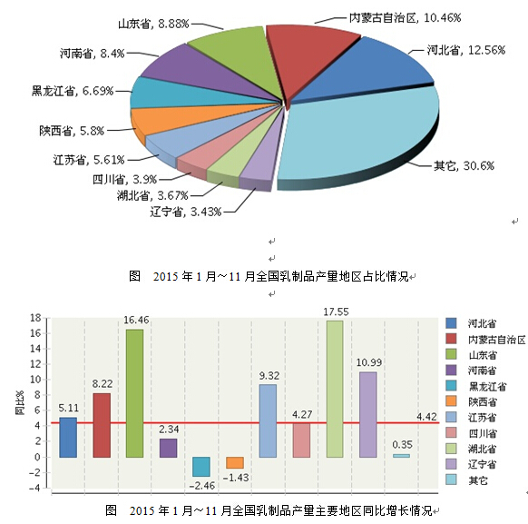 2015年1~11月乳制品各省产量情况