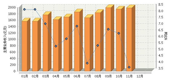 20151月~11月,全国食品行业累计完成主营业务收入19,510.78亿元,同比增长6.23%。主营业务收入总体呈环比上升的走势,其中:11月份完成主营业务收入1983.88亿元,同比增长3.82%