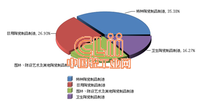 据国家统计局数据显示,2015年1~12月特种陶瓷完成累计主营业务收入同比增长4.22%,占全国陶瓷行业主营业务收入(下同)的35.38%;日用陶瓷累计同比增长11.72%,占26.93%;园林、陈设艺术及其他陶瓷累计同比增长9.17%,占21.42%;卫生陶瓷累计同比增长10.05%,占16.27%。