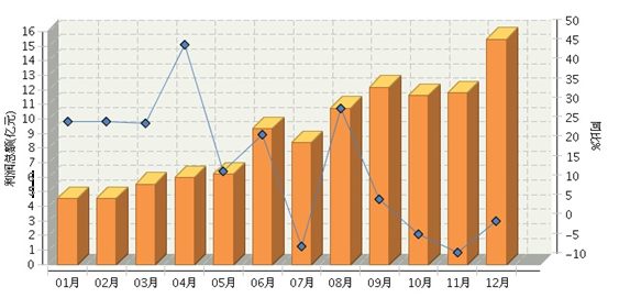 2015年1月~12月,全国玩具行业累计完成利润总额106.21亿元,同比增长9.64%。其中,4月份完成利润总额5.97亿元,同比增长46.49%,是全年增速最快的月份;12月份完成利润总额15.46亿元,是全年完成利润总额最多的月份,同比增长1.3%。(参见图1-1)