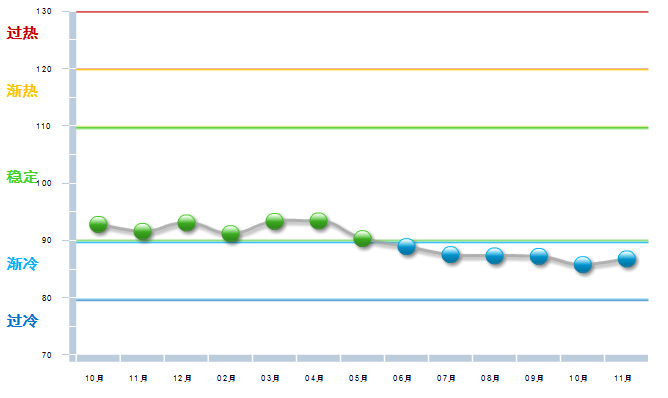 2014年10月中轻工艺美术景气指数在冲高到103.92开始回落,到15年2月已降至渐冷区域,经过几个月现仍在渐冷与稳定之间徘徊,15年7—8月运行在稳定区域的下限,10月降速加快接近渐冷区域下限,11月开始回升。(参见图2)