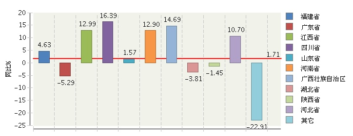 从同比增速看,产量前十的地区中,四川、广西、江西、河南、河北以10%以上增速,依次排在前五位;广东、湖北、陕西出现5.29%、3.81%、1.45%不等的负增长,增速居尾,其中广东由上年同期产量首位降至第二。