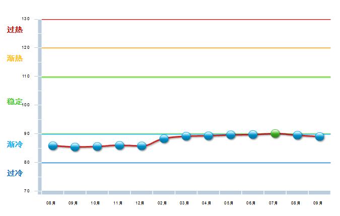 2016年8月至2017年9月,中轻皮革景气指数基本稳定,在90附近小幅波动,处于渐冷提示区运行(参见图3)。