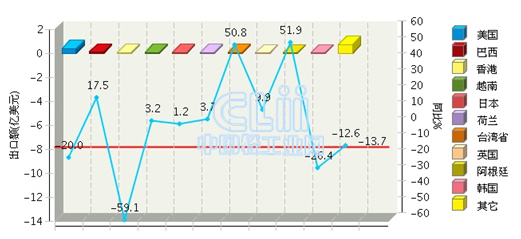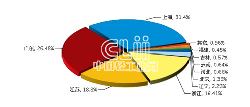 从出口省市来看,上海、广东、江苏、浙江、辽宁是出口额最大的五个区域,其中上海完成累计出口额0.57亿美元(占31.4%),同比增长-15.18%。