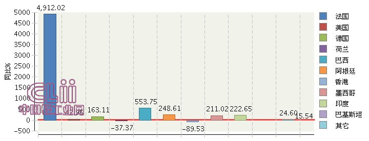 2017年,湖北照明行业完成累计出口额1.42亿美元,同比增长15.54%。出口额排在前五位的国家依次是法国、美国、德国、荷兰和巴西。其中:法国完成累计出口额0.28亿美元(占19.95%),同比增长4912.02%;美国完成累计出口额0.27亿美元(占18.91%),同比增长42.95%。