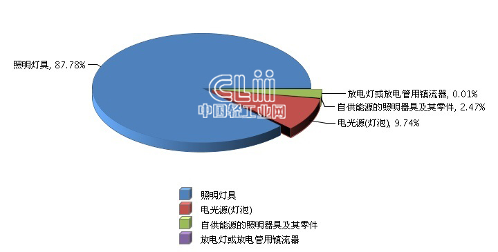从子行业分布来看,照明灯具完成累计出口额1.25亿美元(占87.78%),同比增长9.35%;电光源(灯泡)完成累计出口额0.14亿美元(占9.74%),同比增长183.61%;自供能源的照明器具及其零件完成累计出口额0.04亿美元(占2.47%),同比增长8.63%;放电灯或放电管用镇流器完成累计出口额0亿美元(占0.01%),同比增长-98.67%。