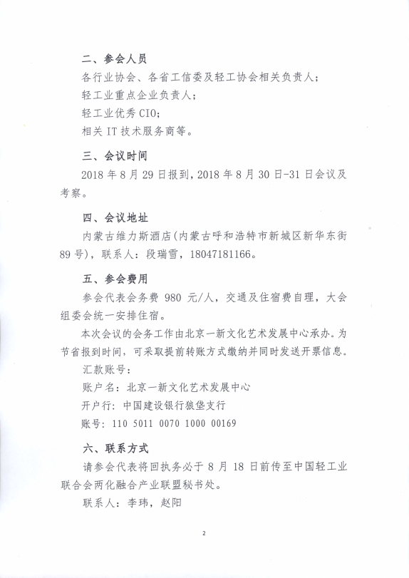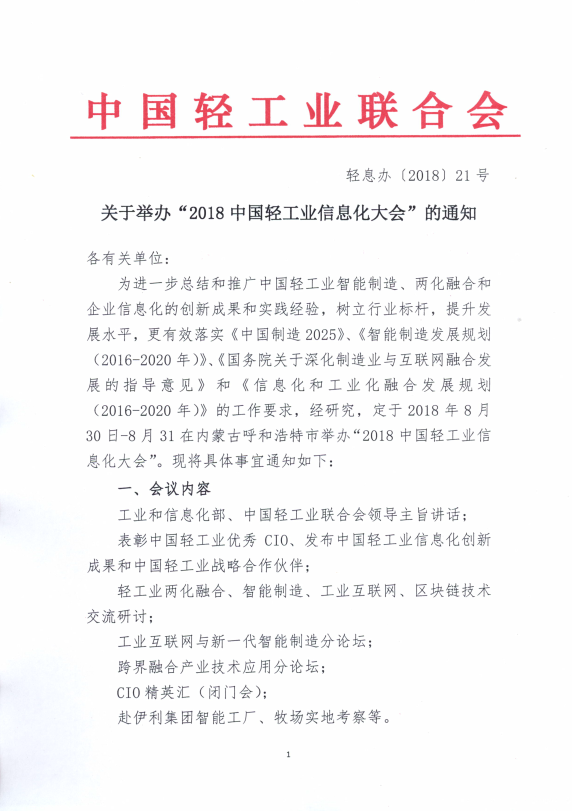 为进一步总结和推广中国轻工业智能制造、两化融合和企业信息化的创新成果和实践经验,树立行业标杆,提升发展水平,更有效落实《中国制造2025》、《智能制造发展规划(2016-2020年)》、《国务院关于深化制造业与互联网融合发展的指导意见》和《信息化和工业化融合发展规划(2016-2020年)》的工作要求,经研究,定于2018年8月30日-8月31在内蒙古呼和浩特市举办“2018中国轻工业信息化大会”。