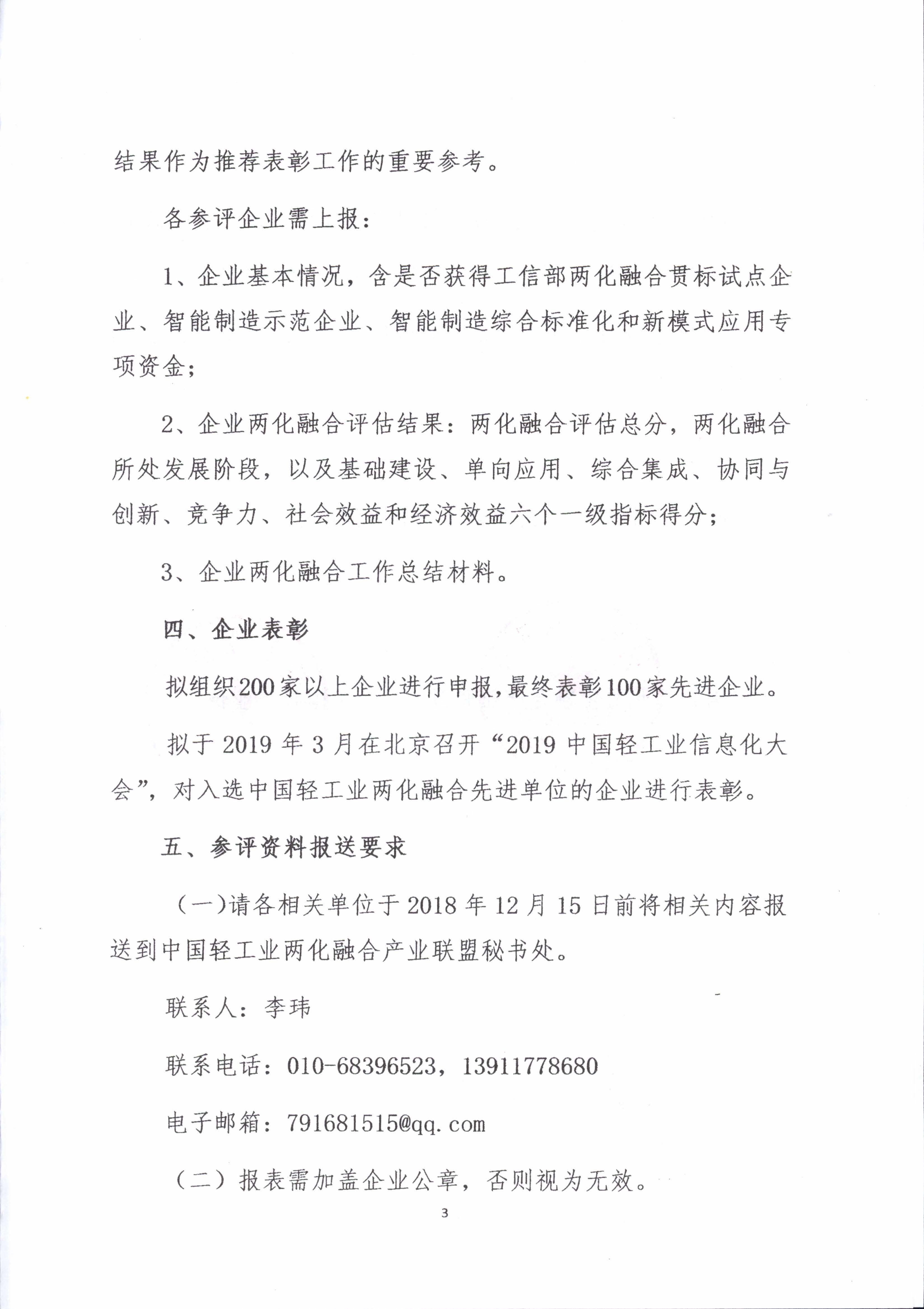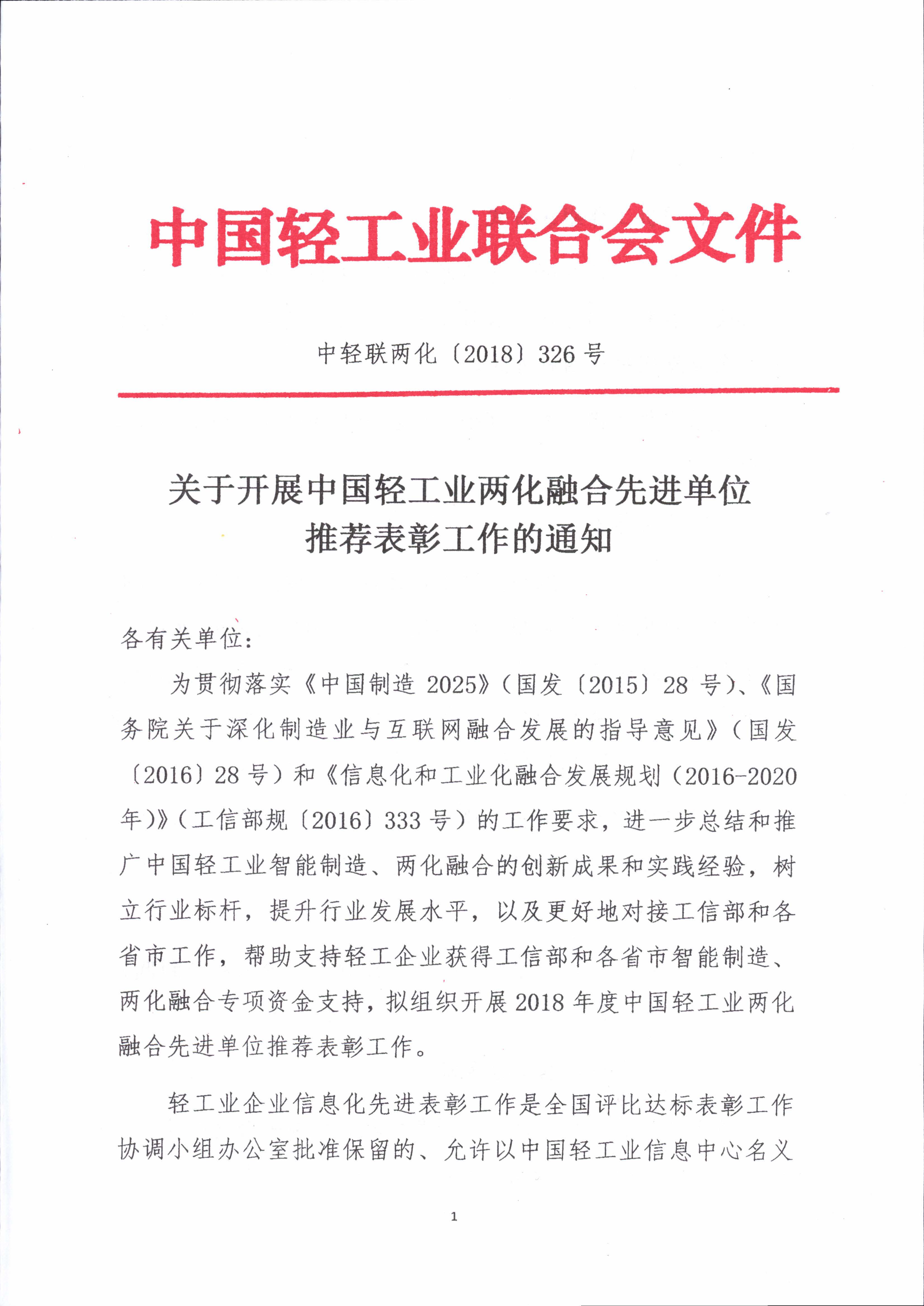 关于2018年度中国轻工业两化融合先进单位推荐表彰申报工作启动通知