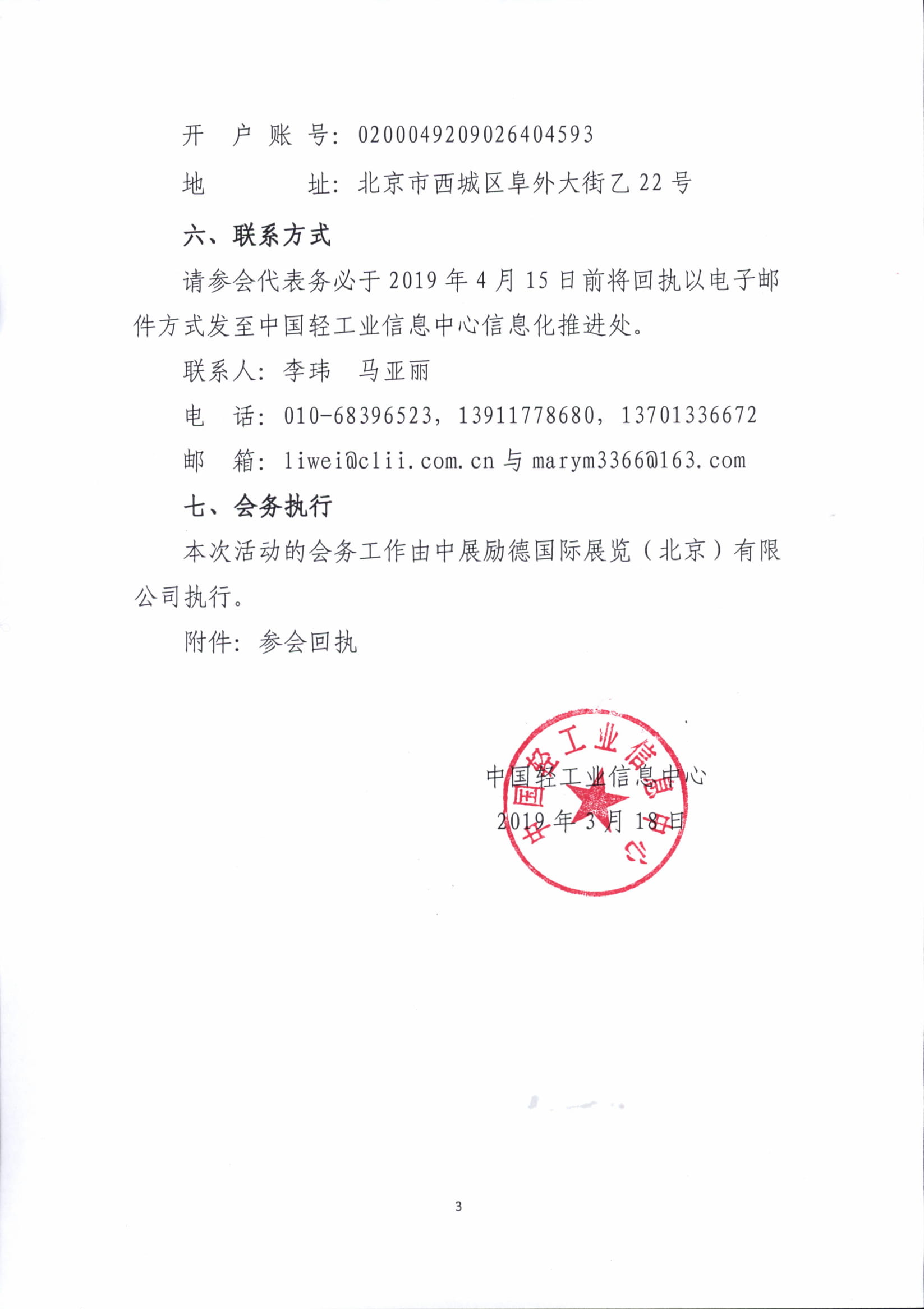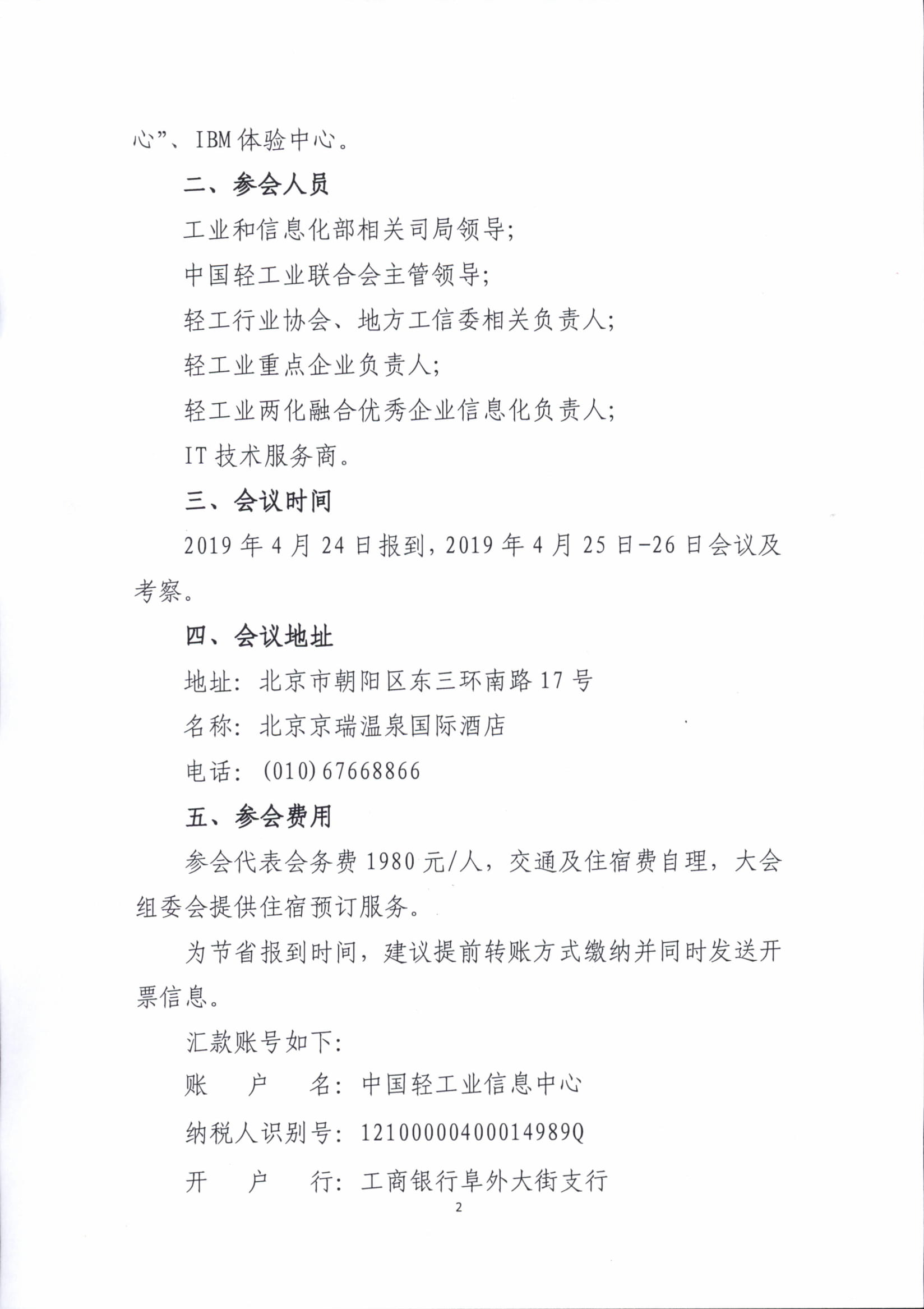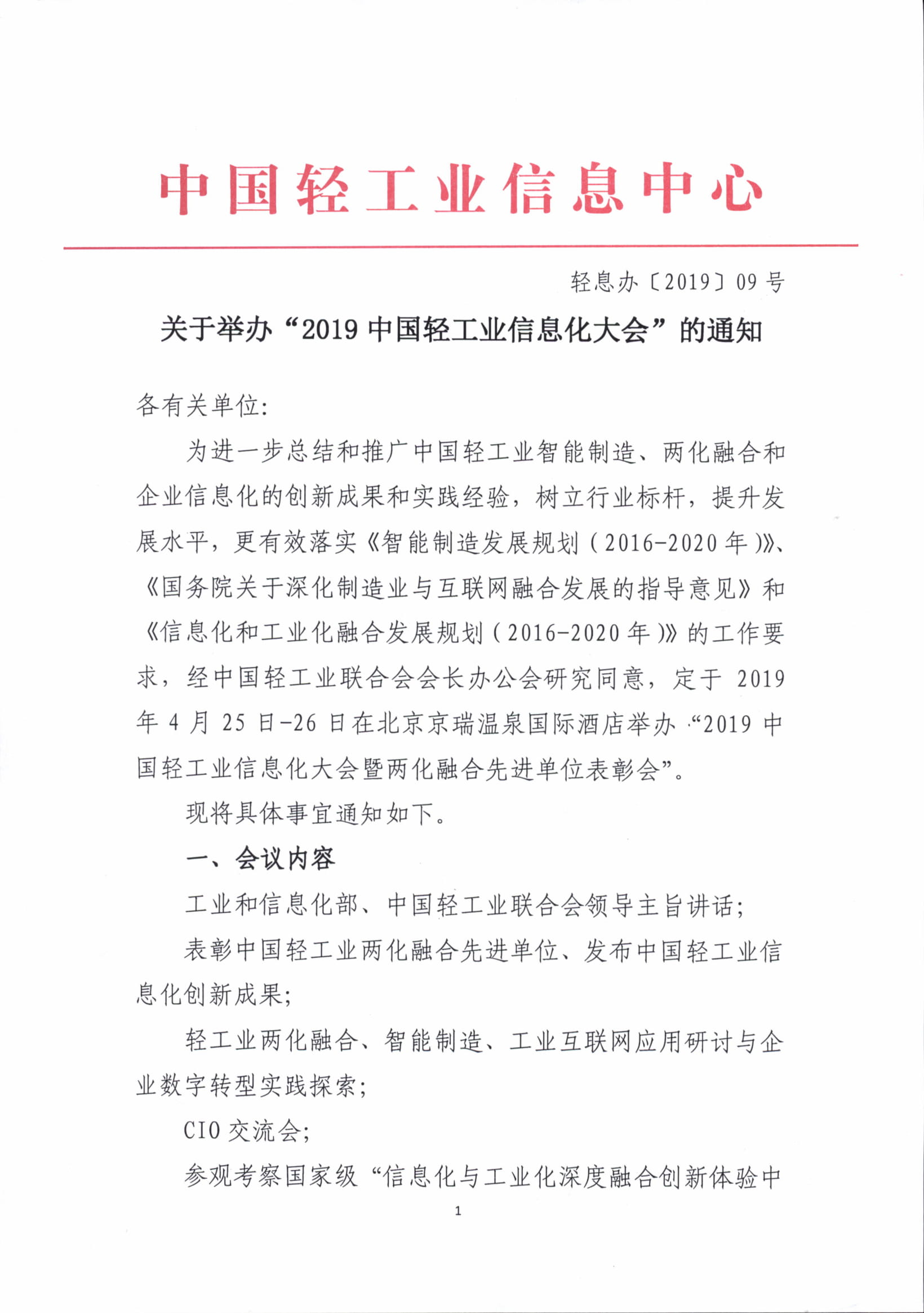 为进一步总结和推广中国轻工业智能制造、两化融合和企业信息化的创新成果和实践经验,树立行业标杆,提升发展水平,更有效落实《智能制造发展规划(2016-2020年)》、《国务院关于深化制造业与互联网融合发展的指导意见》和《信息化和工业化融合发展规划 (2016-2020年)》的工作要求,经 会长办公会研究同意,定于 2019年4月25日-26日在北京京瑞温泉国际酒店举办“2019中国轻工业信息化大会暨两化融合先进单位表彰会”。