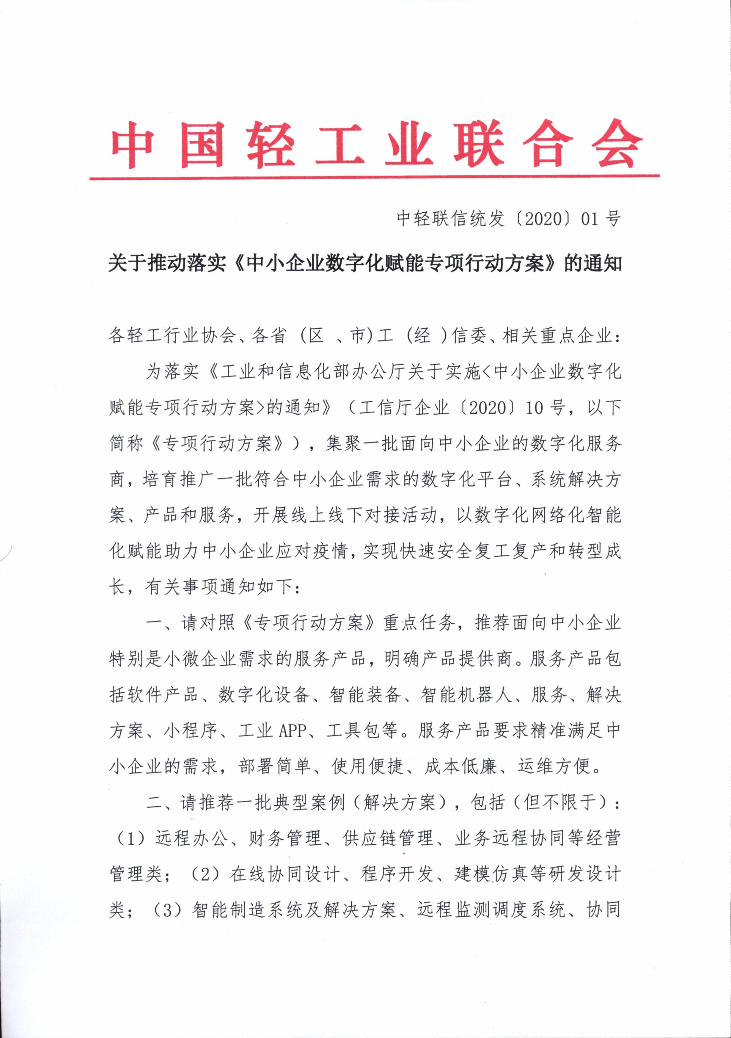 为落实《工业和信息化部办公厅关于实施<中小企业数字化赋能专项行动方案>的通知》(工信厅企业〔2020〕10号,以下简称《专项行动方案》),