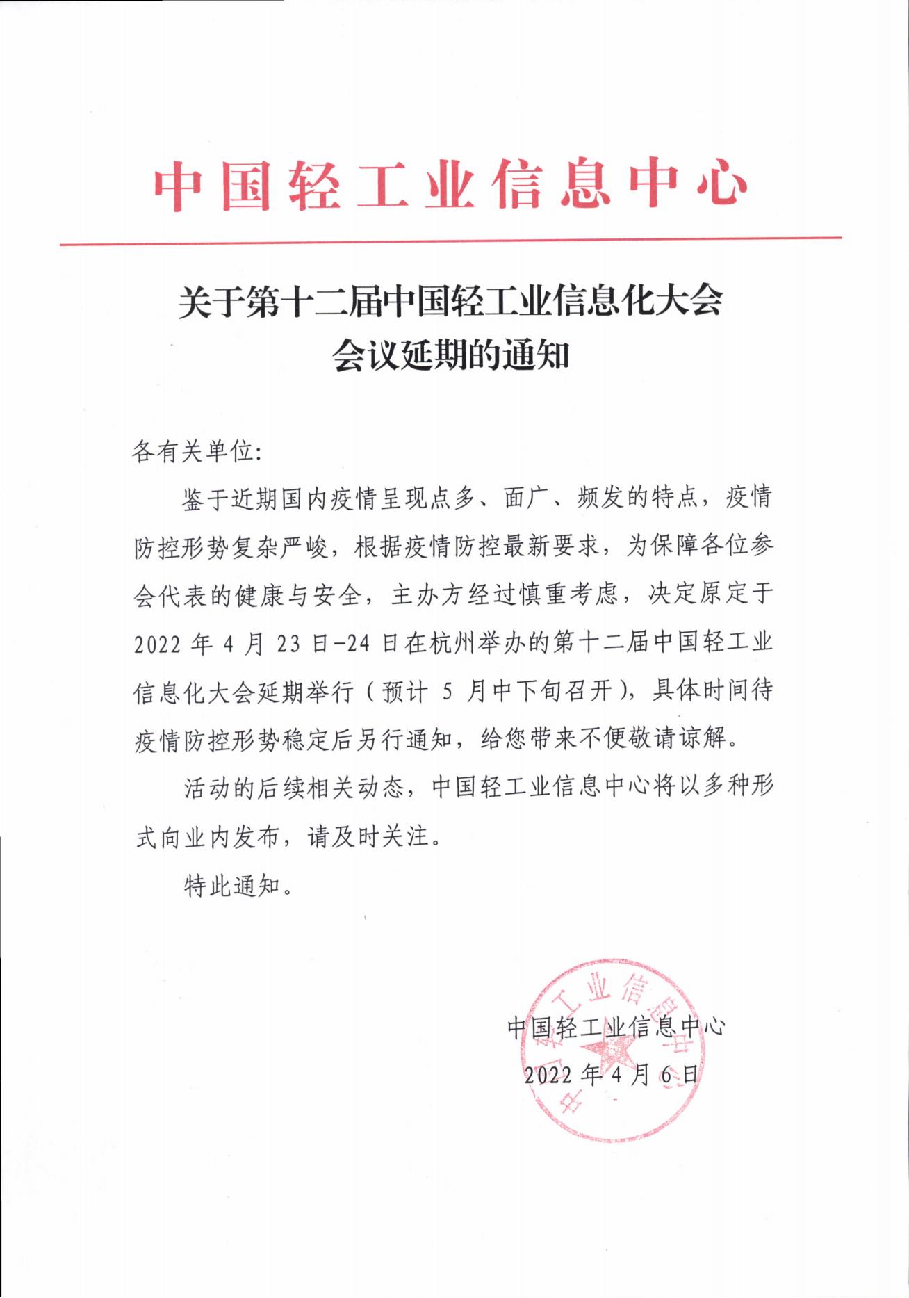 鉴于近期国内疫情呈现点多、面广、频发的特点,疫情防控形势复杂严峻,根据疫情防控最新要求,为保障各位参会代表的健康与安全,主办方经过慎重考虑,决定原定于2022年4月23日-24日在杭州举办的第十二届中国轻工业信息化大会延期举行(预计5月中下旬召开),具体时间待疫情防控形势稳定后另行通知,给您带来不便敬请谅解。