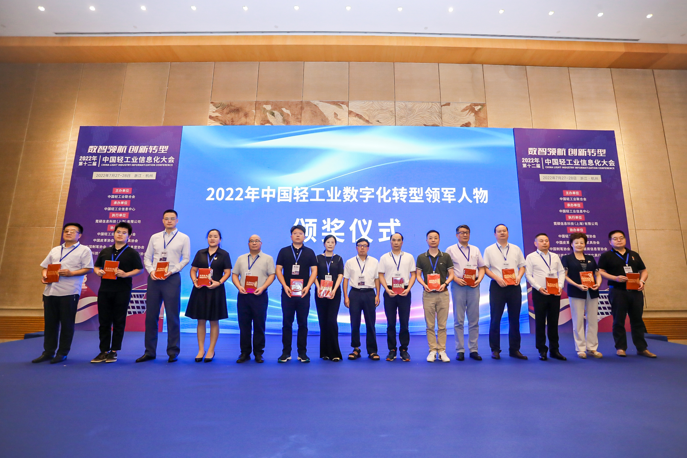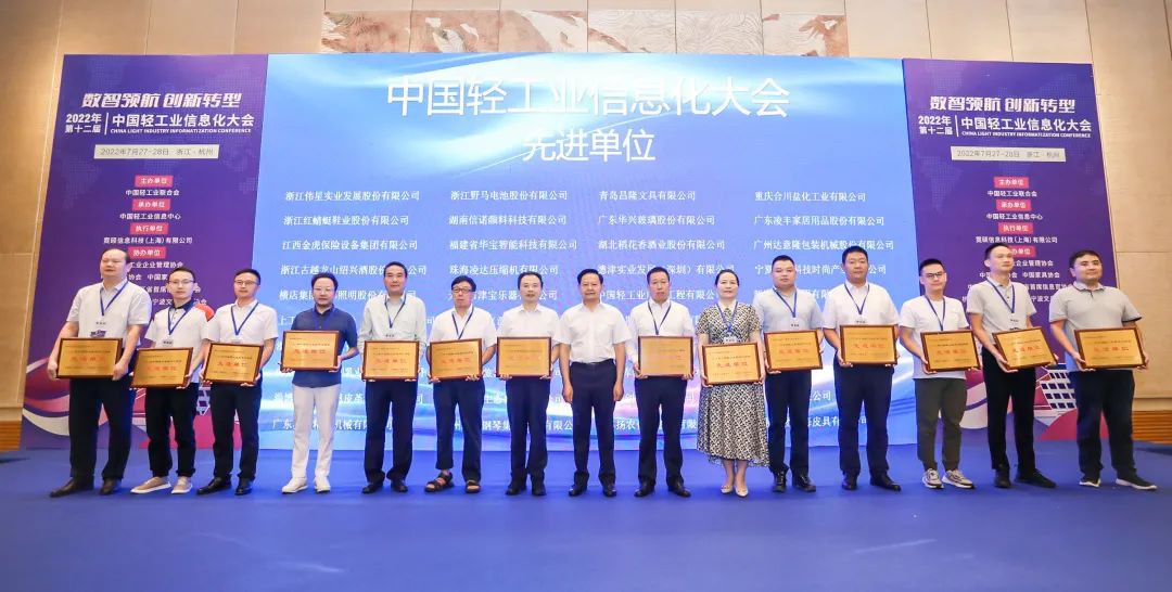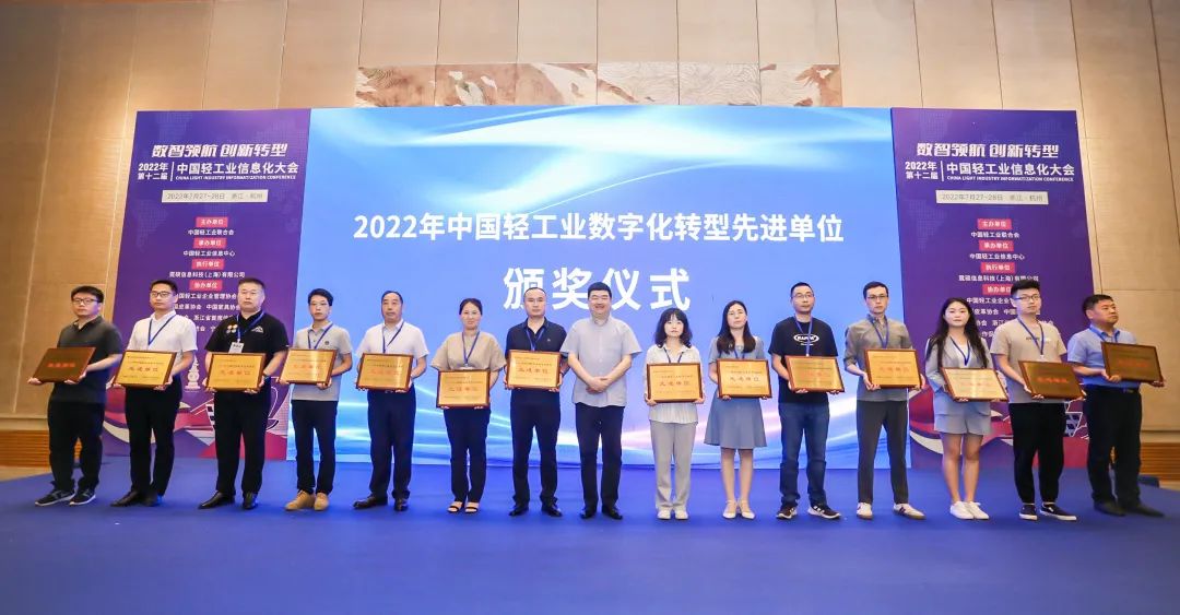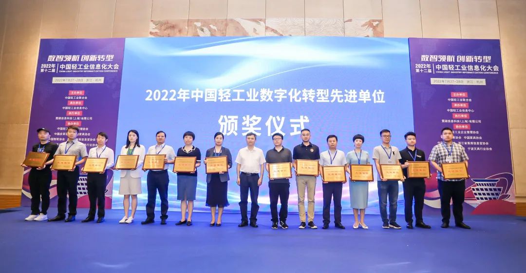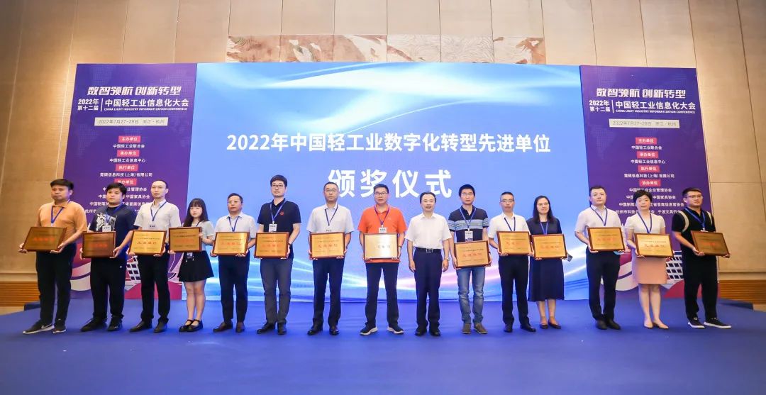 承办,中国轻工业企业管理协会、中国皮革协会、中国家具协会、中国制笔协会、浙江省首席信息官协会、杭州市科技合作促进会、宁波文具行业协会等协办的“第十二届中国轻工业信息化大会”圆满举行。此次会议以“数智领航 创新转型”为主题,旨在深入贯彻落实党中央国务院两化深度融合战略部署,促进数字技术和实体经济深度融合,赋能轻工业转型升级。会上还举行了2022年中国轻工业数字化转型先进单位、2022年中国轻工业数字化转型领军人物表彰仪式。
